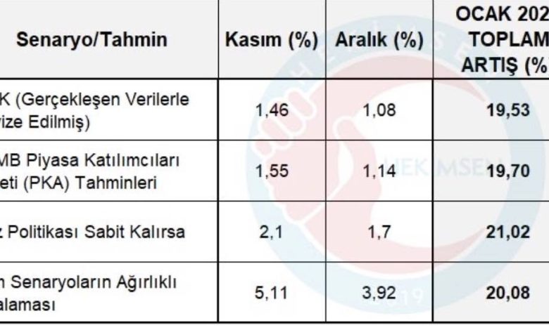 2026 OCAK ZAMMI TAHMİN SENARYOLARI Kasım ve Aralık ayı enflasyon senaryolarına göre, OCAK 2026’da maaş artışı %20 civarında . TÜİK Gerçekleşebilecek Tahminlere Göre: %19,53 TCMB Piyasa Katılımcıları Anketi (PKA) Tahminlere Göre: %19,70 Faiz politikası sabit kalırsa: %21,02 Ağırlıklı ortalama: %20,08 En iyimser senaryoda bile, artış oranı yıl boyunca yaşanan kayıpları telafi etmiyor. Gerçek enflasyon, maaş artışlarını hâlâ geride bırakıyor.